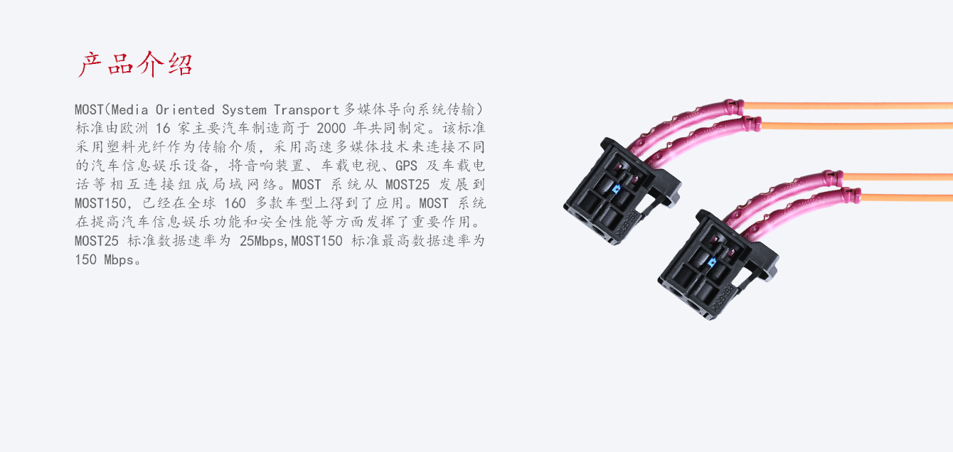 ● 6. 高速率數(shù)據(jù)傳輸,數(shù)據(jù)量大,MOST25標(biāo)準(zhǔn)數(shù)據(jù)速率為25Mbps,MOST150標(biāo)準(zhǔn)zui高數(shù)據(jù)速率為150Mbps